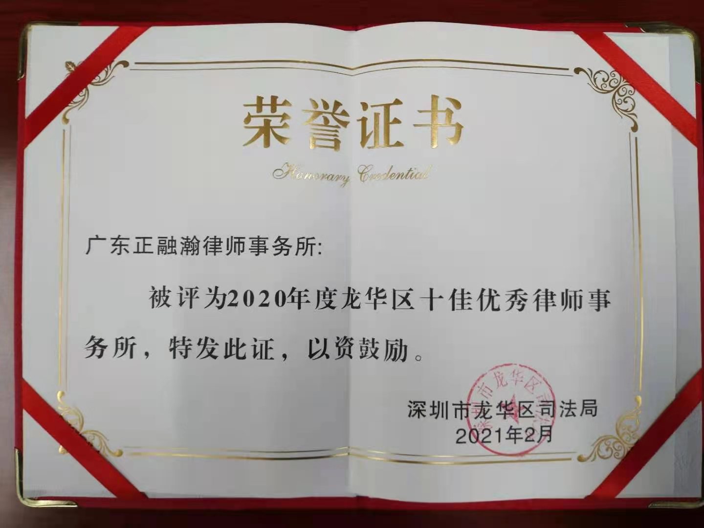2021年2月, 广东正融瀚律师事务所荣获龙华区2020年度十佳优秀律师事务所
