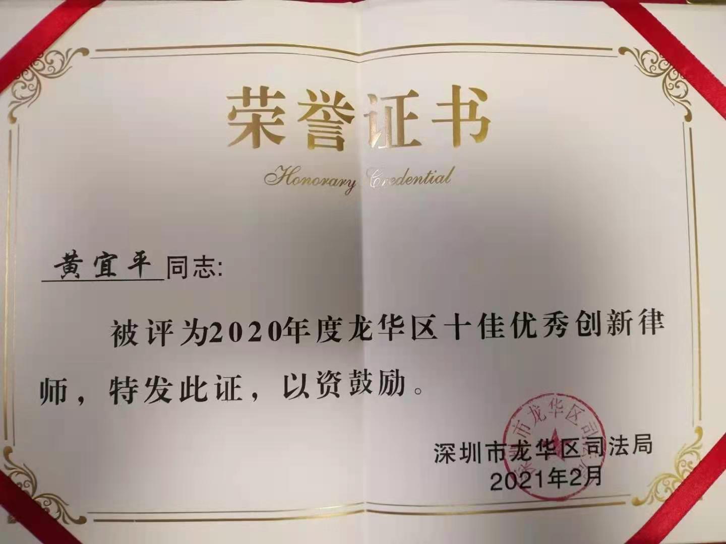 本所黄宜平律师荣获龙华区2020年度十佳优秀创新律师