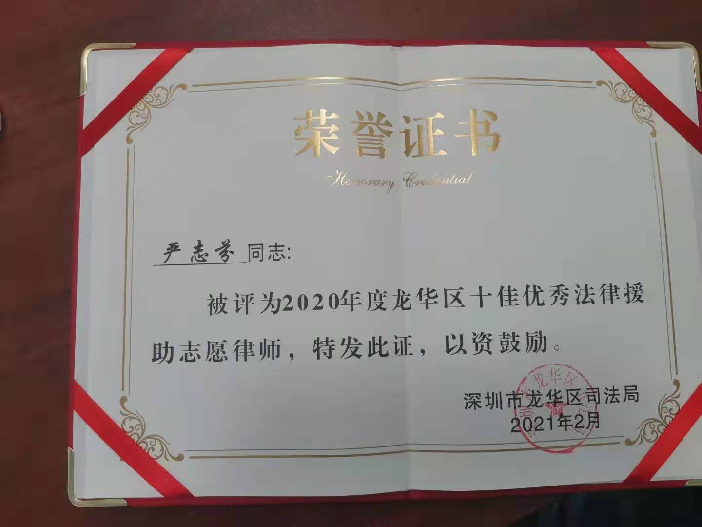 本所严志芬律师荣获龙华区2020年度十佳优秀法律援助律师