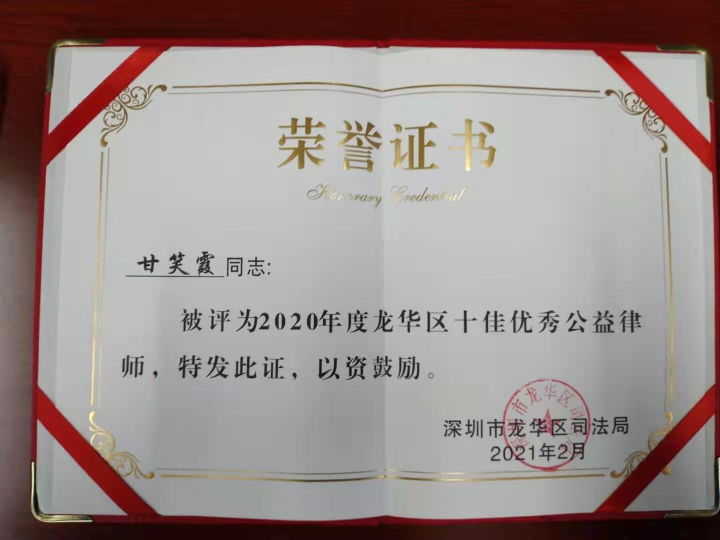 本所甘笑霞律师荣获龙华区2020年度十佳优秀公益律师